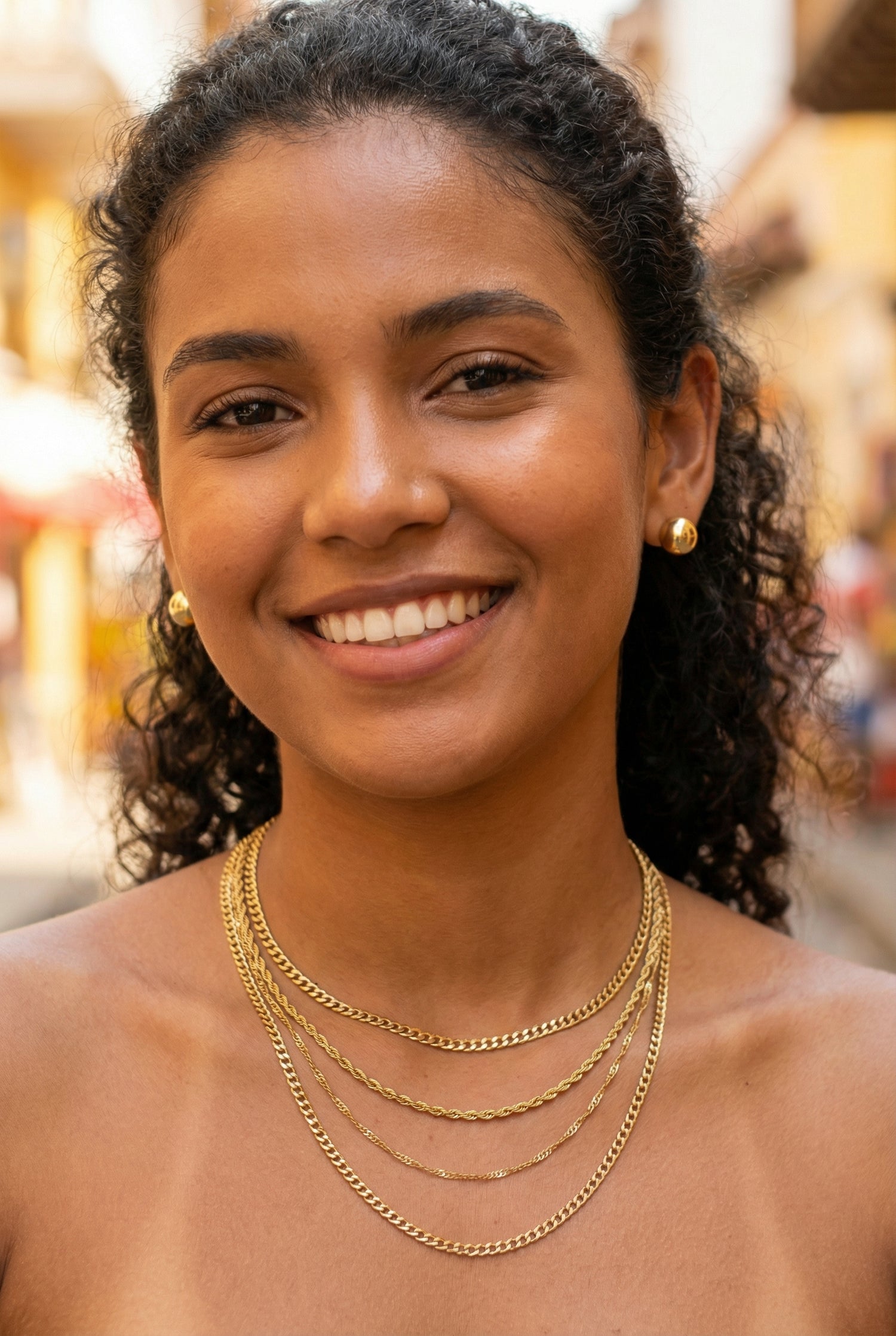 Combina elegancia, versatilidad y comodidad en un solo set. Incluye 5 pares de topos en oro laminado, en tamaños 2-3-4-6-8mm. Perfectos para usar todos los días o regalar.