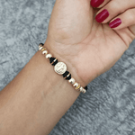 Esta elegante manilla es perfecta para quieren mostrar su devoción a San Benito. Hecho de oro laminado, este accesorio tiene un acabado brillante y duradero. Una manera hermosa de simbolizar amor y protección.