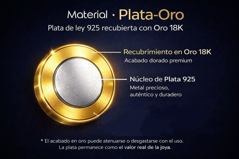 Esta joya Plata-Oro están elaboradas en plata de ley 925, un metal precioso auténtico y duradero, y cuentan con un recubrimiento en oro 18K que les brinda un acabado dorado premium.