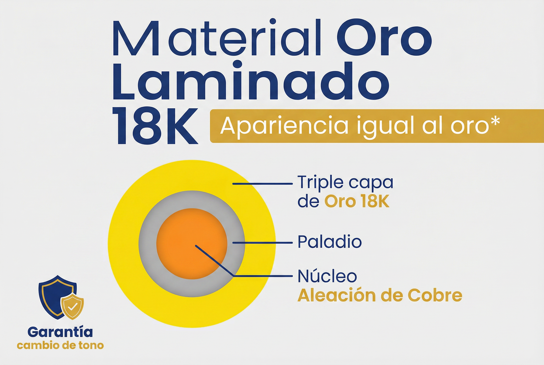 En Vibrantto Joyería solo trabajamos con Oro Laminado 18k, el cual es obtenido mediante un proceso donde se aplican tres capas de oro 18K sobre un metal semiprecioso como base.